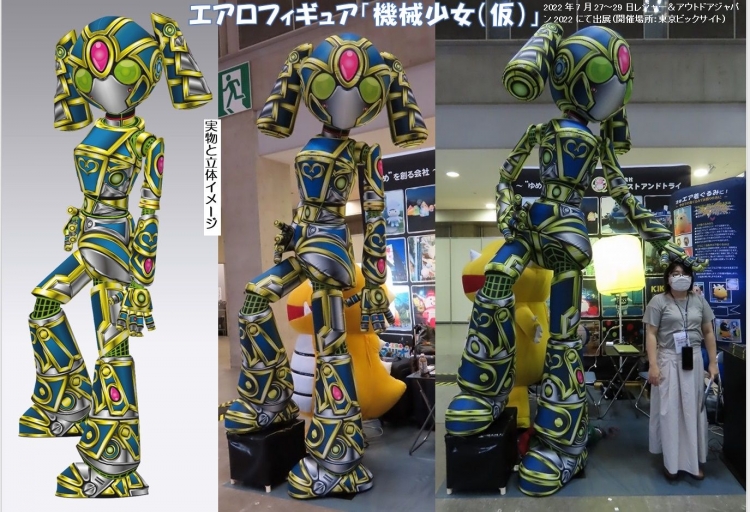 当社ではインフレータブルバルーンに全面印刷を施すことで、1体だけでは高価と感じられるかもしれませんが、2体目以降から大変安価にリアルで色鮮やかな造形を製作できるようになりました!まずは展示会場にて、当社自慢の全面印刷モデル「機械少女」をご覧ください。